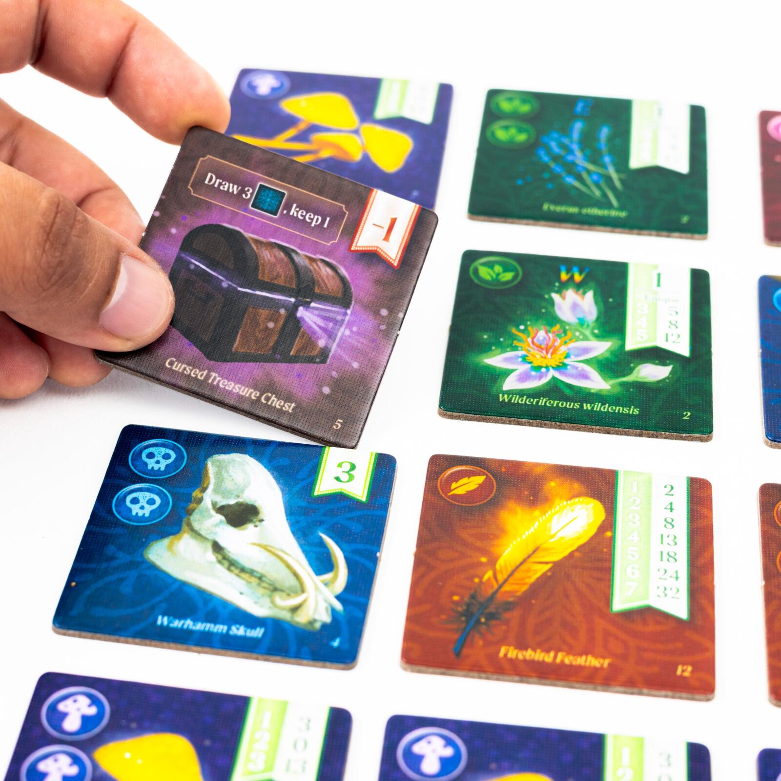 Through two rounds (twilight and moonlight), players compete to collect the strongest sets of magical items like firebird feathers, creature skulls, glowing mushrooms, mysterious eggs, and rare herbs. These items have value when collected in specific sets, but can also be combined to fulfill recipes needed for concoctions, scoring you even more prestige!