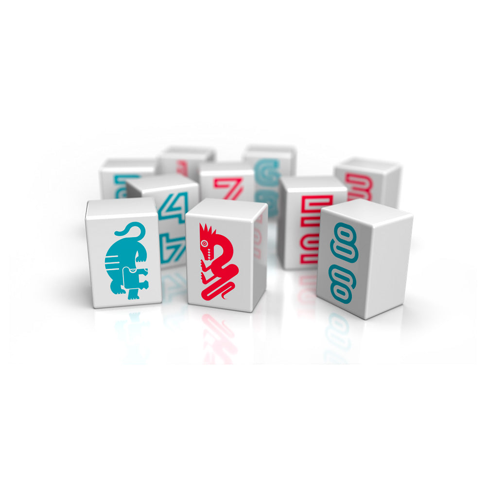 The game contains 38 tiles: 36 numbered tiles with one 1, two 2s, etc. up to eight 8s, along with a tiger and a dragon. Shuffle the tiles face down, then each player takes tiles based on the player count, with the round's starting player taking one additional tile. With four players, for example, the starting player draw ten tiles and all other players nine. At least one tile will remain out of play.
